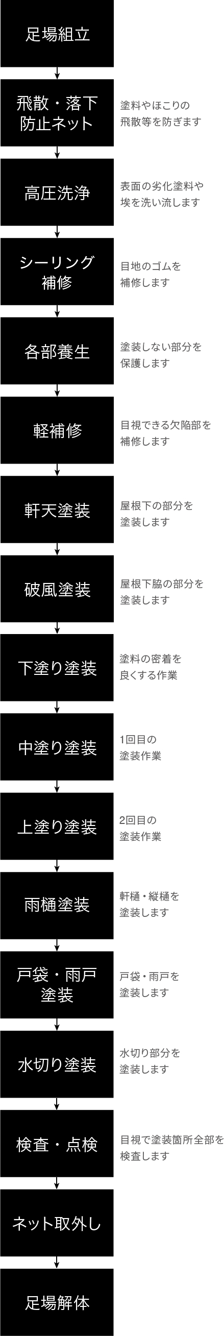 ◎仮説足場、◎養生ネット、◎高圧洗浄、◎未塗装部養生、◎下地調整、◎霧除塗装、◎軒裏塗装、◎破風板・鼻隠し塗装、◎水切り・トタン塗装、◎フードカバー塗装